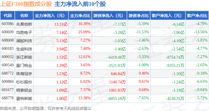 资金流向方面,上证F300(000099)指数成份股当日主力资金净流出合计24.5亿元,游资资金净流入合计7.42亿元,散户资金净流入合计17.08亿元。成份股资金流向详情见下表: