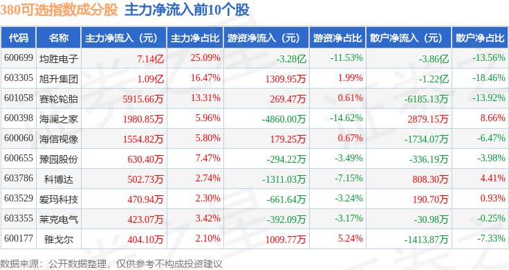 资金流向方面,380可选(000107)指数成份股当日主力资金净流入合计5.59亿元,游资资金净流出合计1.87亿元,散户资金净流出合计3.73亿元。成份股资金流向详情见下表: