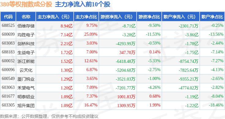 资金流向方面,380等权(000115)指数成份股当日主力资金净流出合计29.56亿元,游资资金净流入合计6.14亿元,散户资金净流入合计23.42亿元。成份股资金流向详情见下表: