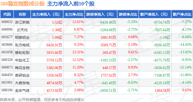 资金流向方面,380稳定(000142)指数成份股当日主力资金净流出合计7.51亿元,游资资金净流入合计6.13亿元,散户资金净流入合计1.38亿元。成份股资金流向详情见下表: