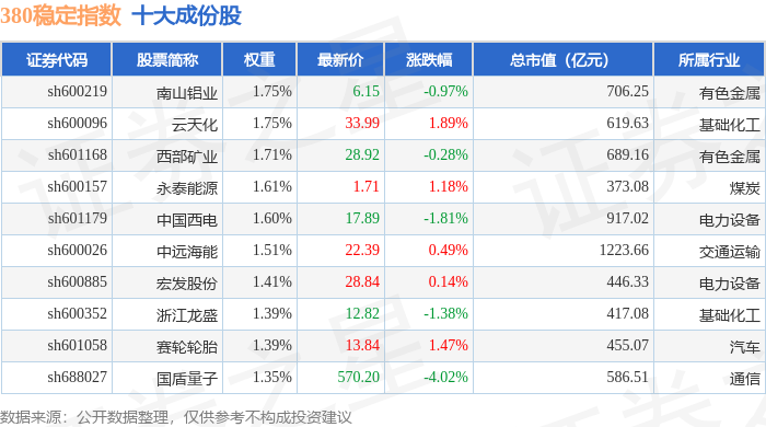 380稳定(000142)指数十大成份股详情如下: