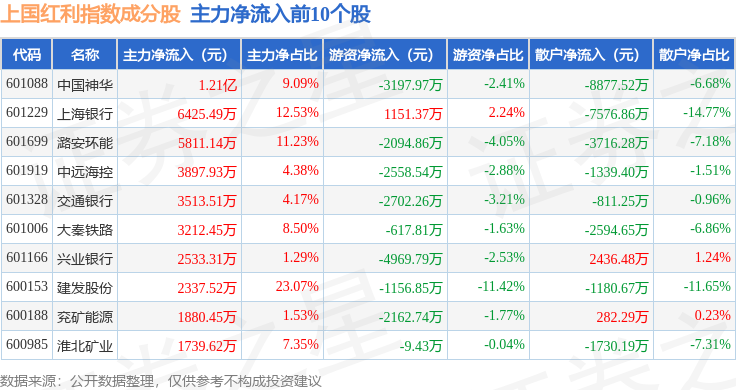 资金流向方面,上国红利(000151)指数成份股当日主力资金净流出合计4393.02万元,游资资金净流出合计1.37亿元,散户资金净流入合计1.81亿元。成份股资金流向详情见下表: