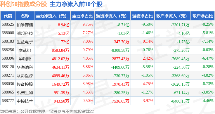 资金流向方面,科创50(000688)指数成份股当日主力资金净流出合计13.22亿元,游资资金净流入合计15.98亿元,散户资金净流出合计2.76亿元。成份股资金流向详情见下表:
