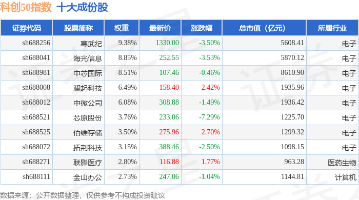 科创50(000688)指数十大成份股详情如下: