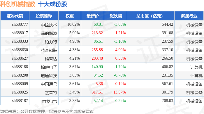 证券之星消息,4月21日,科创机械(000693)指数报收于1645.7点,涨0.58%,成交212.58亿元,换手率1.25%。当日该指数成份股中,上涨的有27家,杰普特以13.57%的涨幅领涨,下跌的有22家,联赢激光以4.8%的跌幅领跌。