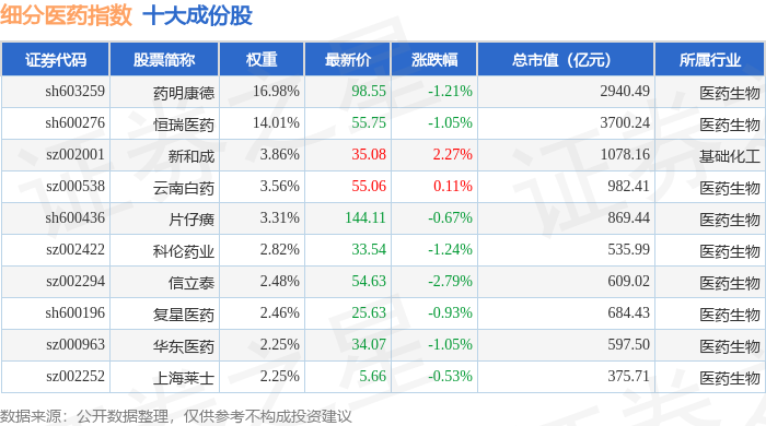 细分医药(000814)指数十大成份股详情如下: