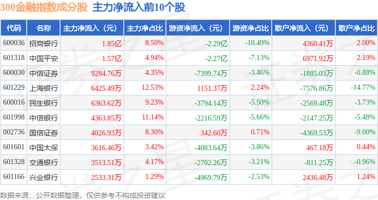 资金流向方面,300金融(000914)指数成份股当日主力资金净流出合计7.21亿元,游资资金净流出合计4.2亿元,散户资金净流入合计11.41亿元。成份股资金流向详情见下表: