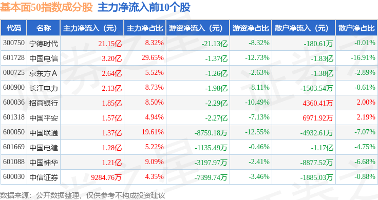 资金流向方面,基本面50(000925)指数成份股当日主力资金净流入合计15.42亿元,游资资金净流出合计28.82亿元,散户资金净流入合计13.4亿元。成份股资金流向详情见下表: