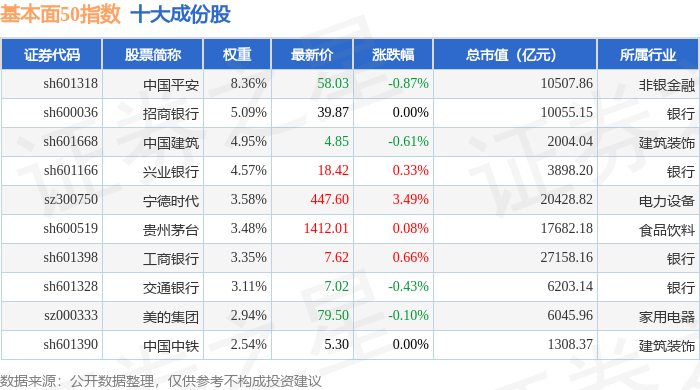 基本面50(000925)指数十大成份股详情如下: