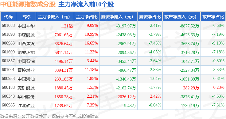 资金流向方面,中证能源(000928)指数成份股当日主力资金净流入合计1.45亿元,游资资金净流出合计9992.61万元,散户资金净流出合计4493.02万元。成份股资金流向详情见下表: