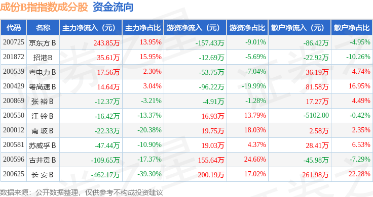 资金流向方面,成份B指(399003)指数成份股当日主力资金净流出合计358.72万元,游资资金净流入合计86.53万元,散户资金净流入合计272.19万元。成份股资金流向详情见下表: