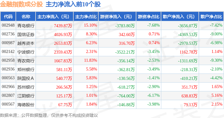 资金流向方面,金融指数(399240)成份股当日主力资金净流出合计14.64亿元,游资资金净流入合计3.2亿元,散户资金净流入合计11.44亿元。成份股资金流向详情见下表: