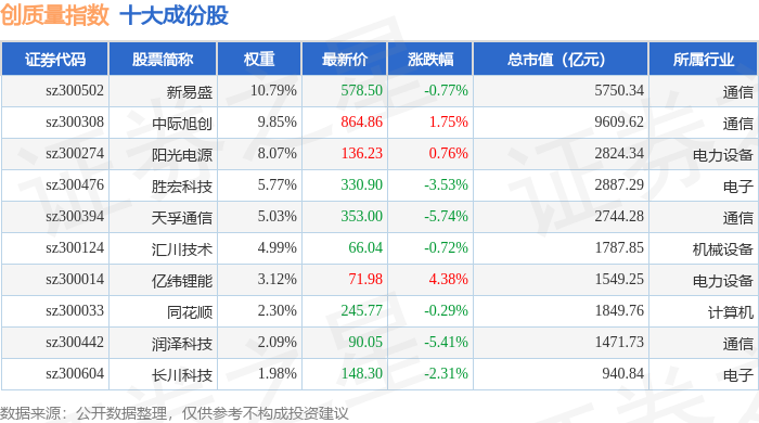 创质量(399269)指数十大成份股详情如下: