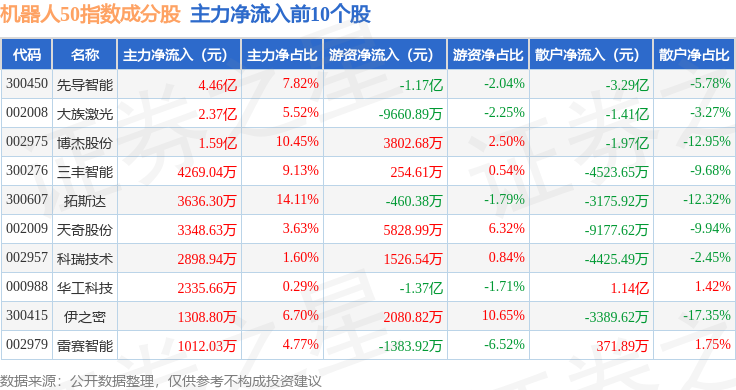 资金流向方面,机器人50(399283)指数成份股当日主力资金净流出合计3.45亿元,游资资金净流入合计1.55亿元,散户资金净流入合计1.9亿元。成份股资金流向详情见下表: