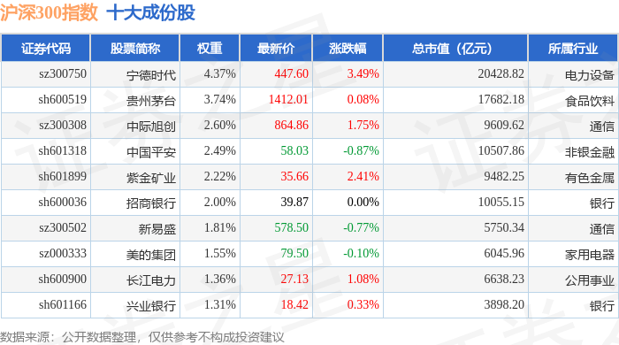 沪深300(399300)指数十大成份股详情如下: