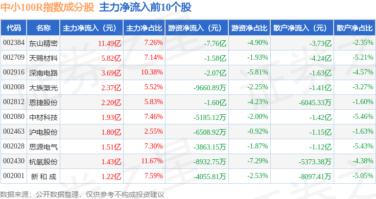 资金流向方面,中小100R(399333)指数成份股当日主力资金净流出合计51.65亿元,游资资金净流入合计10.18亿元,散户资金净流入合计41.47亿元。成份股资金流向详情见下表: