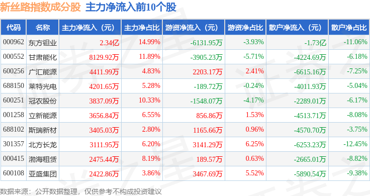 资金流向方面,新丝路(399429)指数成份股当日主力资金净流出合计43.56亿元,游资资金净流入合计9.55亿元,散户资金净流入合计33.67亿元。成份股资金流向详情见下表: