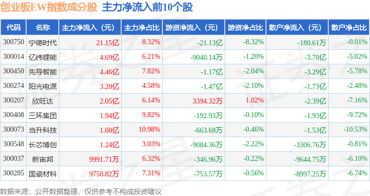 资金流向方面,创业板EW(399635)指数成份股当日主力资金净流出合计62.58亿元,游资资金净流入合计13.43亿元,散户资金净流入合计49.14亿元。成份股资金流向详情见下表: