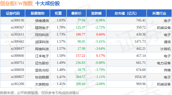 创业板EW(399635)指数十大成份股详情如下: