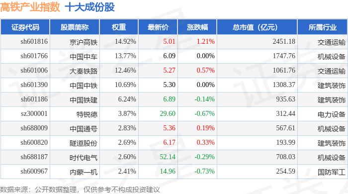 高铁产业(399807)指数十大成份股详情如下: