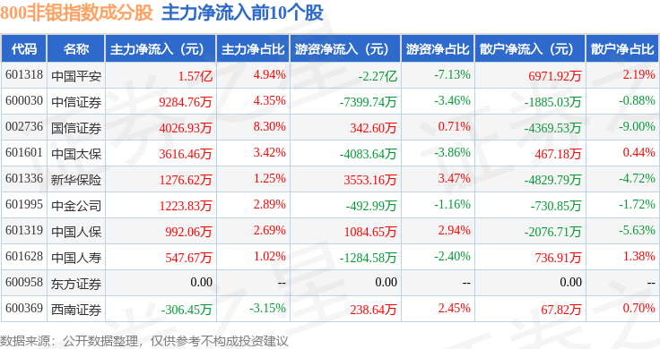 资金流向方面,800非银(399966)指数成份股当日主力资金净流出合计14.99亿元,游资资金净流入合计1.81亿元,散户资金净流入合计13.18亿元。成份股资金流向详情见下表: