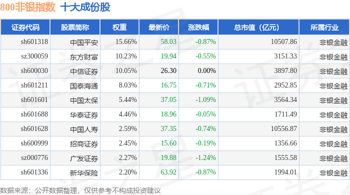 证券之星消息,4月21日,800非银(399966)指数报收于5770.66点,跌0.8%,成交245.77亿元,换手率0.54%。当日该指数成份股中,上涨的有1家,中金公司以0.24%的涨幅领涨,下跌的有46家,国盛证券以10.01%的跌幅领跌。