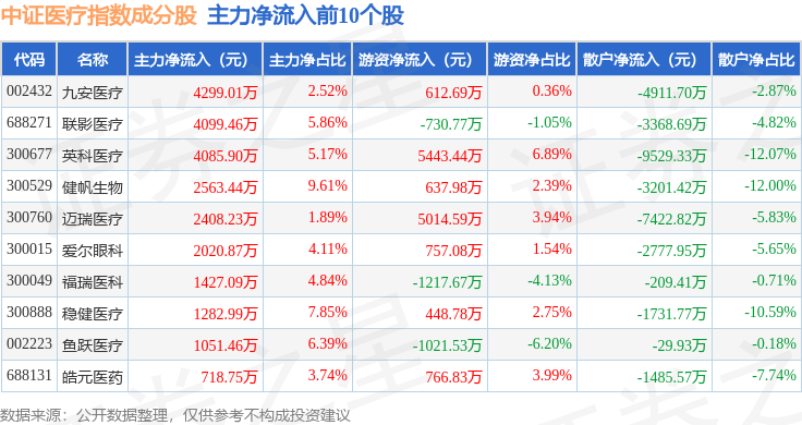 资金流向方面,中证医疗(399989)指数成份股当日主力资金净流出合计7.09亿元,游资资金净流入合计4.98亿元,散户资金净流入合计1.94亿元。成份股资金流向详情见下表: