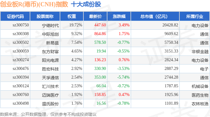创业板R(港币)(CNH)(470006)指数十大成份股详情如下:
