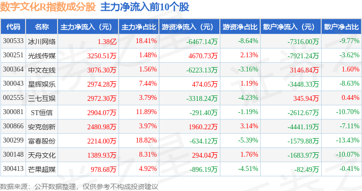 资金流向方面,数字文化R(470047)指数成份股当日主力资金净流出合计11.6亿元,游资资金净流入合计2.4亿元,散户资金净流入合计9.2亿元。成份股资金流向详情见下表: