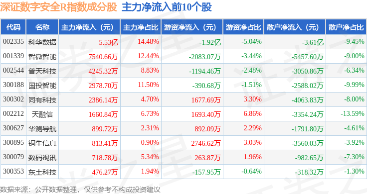 资金流向方面,深证数字安全R(470052)指数成份股当日主力资金净流出合计21.96亿元,游资资金净流入合计2.86亿元,散户资金净流入合计19.11亿元。成份股资金流向详情见下表: