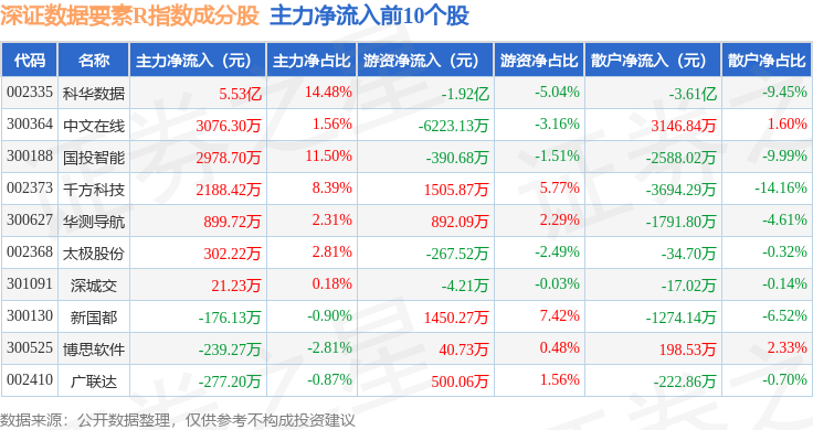 资金流向方面,深证数据要素R(470053)指数成份股当日主力资金净流出合计62.34亿元,游资资金净流入合计9.91亿元,散户资金净流入合计52.43亿元。成份股资金流向详情见下表: