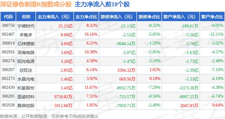 资金流向方面,深证绿色制造R(470069)指数成份股当日主力资金净流出合计5.48亿元,游资资金净流出合计14.75亿元,散户资金净流入合计20.23亿元。成份股资金流向详情见下表: