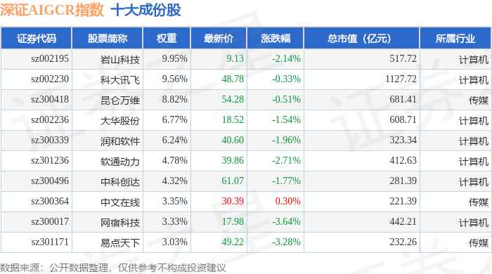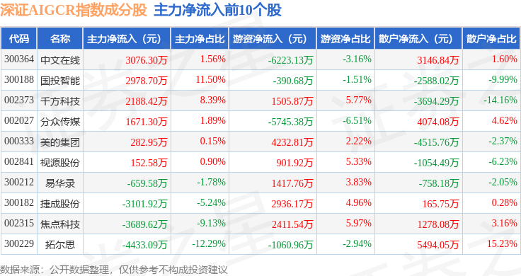 资金流向方面,深证AIGCR(470075)指数成份股当日主力资金净流出合计41.84亿元,游资资金净流入合计5.75亿元,散户资金净流入合计36.09亿元。成份股资金流向详情见下表: