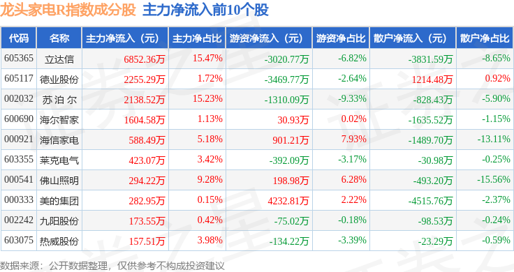 资金流向方面,龙头家电R(480028)指数成份股当日主力资金净流出合计1.77亿元,游资资金净流入合计6110.03万元,散户资金净流入合计1.16亿元。成份股资金流向详情见下表: