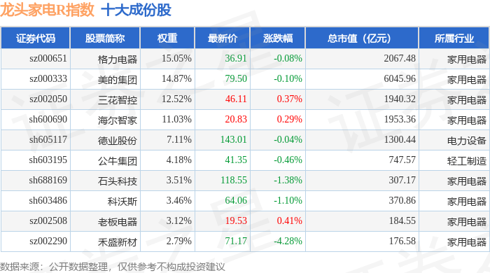 证券之星消息,4月21日,龙头家电R(480028)指数报收于19455.8点,跌0.1%,成交148.4亿元,换手率1.25%。当日该指数成份股中,上涨的有11家,立达信以9.98%的涨幅领涨,下跌的有18家,九阳股份以4.98%的跌幅领跌。
