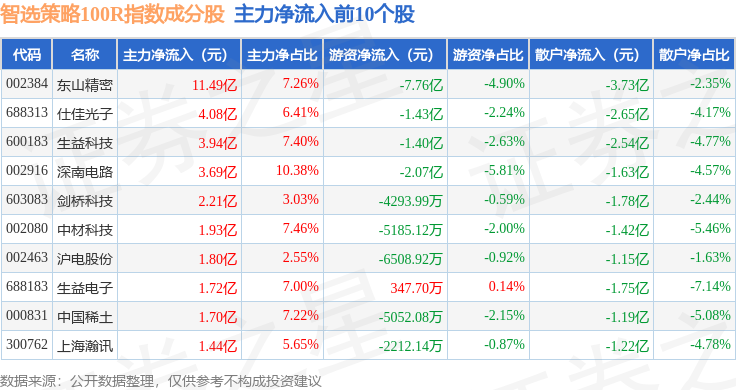 资金流向方面,智选策略100R(489015)指数成份股当日主力资金净流出合计83.01亿元,游资资金净流入合计19.93亿元,散户资金净流入合计63.08亿元。成份股资金流向详情见下表: