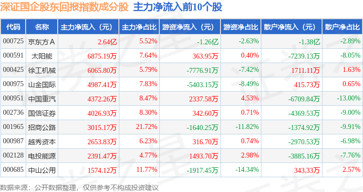 资金流向方面,深证国企股东回报(970064)指数成份股当日主力资金净流出合计6.92亿元,游资资金净流入合计1.25亿元,散户资金净流入合计5.66亿元。成份股资金流向详情见下表: