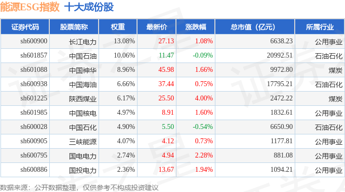 资金流向方面,能源ESG(980133)指数成份股当日主力资金净流出合计1.06亿元,游资资金净流出合计2.99亿元,散户资金净流入合计4.05亿元。成份股资金流向详情见下表: