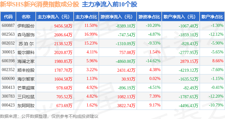 资金流向方面,新华SHS新兴消费(989006)指数成份股当日主力资金净流出合计15.25亿元,游资资金净流入合计3.23亿元,散户资金净流入合计12.02亿元。成份股资金流向详情见下表: