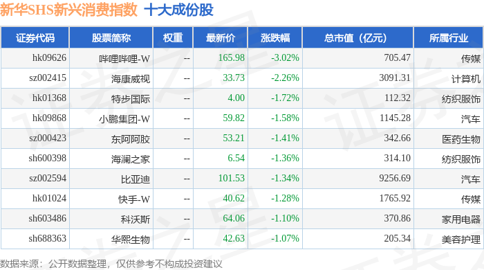 新华SHS新兴消费(989006)指数十大成份股详情如下: