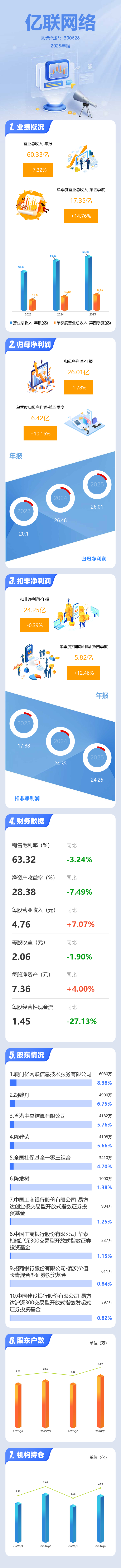 证券之星消息,亿联网络2025年年报显示,当年度公司主营收入60.33亿元,同比上升7.33%;归母净利润26.01亿元,同比下降1.78%;扣非净利润24.25亿元,同比下降0.39%;其中2025年第四季度,公司单季度主营收入17.35亿元,同比上升14.77%;单季度归母净利润6.42亿元,同比上升10.16%;单季度扣非净利润5.82亿元,同比上升12.47%;负债率12.79%,投资收益1.56亿元,财务费用-815.86万元,毛利率63.32%。