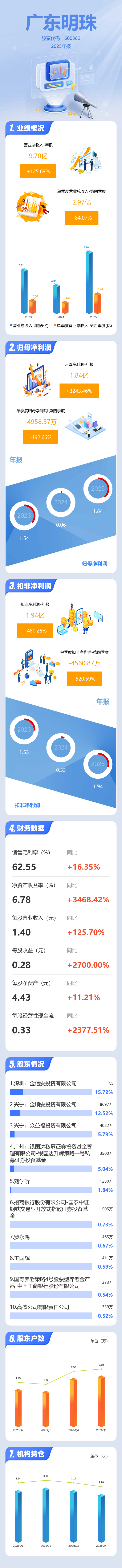 证券之星消息,广东明珠2025年年报显示,当年度公司主营收入9.7亿元,同比上升125.7%;归母净利润1.84亿元,同比上升3243.47%;扣非净利润1.94亿元,同比上升480.25%;其中2025年第四季度,公司单季度主营收入2.97亿元,同比上升84.07%;单季度归母净利润-4958.57万元,同比下降192.67%;单季度扣非净利润-4560.87万元,同比下降520.59%;负债率16.11%,投资收益133.7万元,财务费用611.99万元,毛利率62.55%。