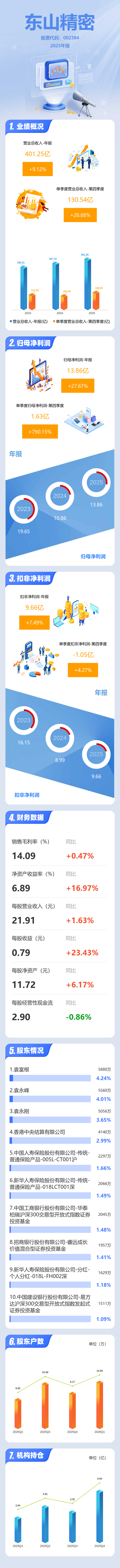 证券之星消息,东山精密2025年年报显示,当年度公司主营收入401.25亿元,同比上升9.12%;归母净利润13.86亿元,同比上升27.67%;扣非净利润9.66亿元,同比上升7.5%;其中2025年第四季度,公司单季度主营收入130.54亿元,同比上升26.69%;单季度归母净利润1.63亿元,同比上升790.16%;单季度扣非净利润-1.05亿元,同比上升4.27%;负债率63.98%,投资收益-928.22万元,财务费用2.62亿元,毛利率14.09%。