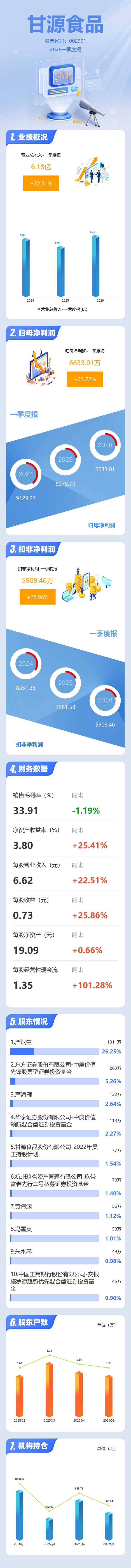 证券之星消息,甘源食品2026年一季报显示,一季度公司主营收入6.18亿元,同比上升22.51%;归母净利润6633.01万元,同比上升25.73%;扣非净利润5909.46万元,同比上升28.98%;负债率17.78%,投资收益59.13万元,财务费用-100.03万元,毛利率33.91%。