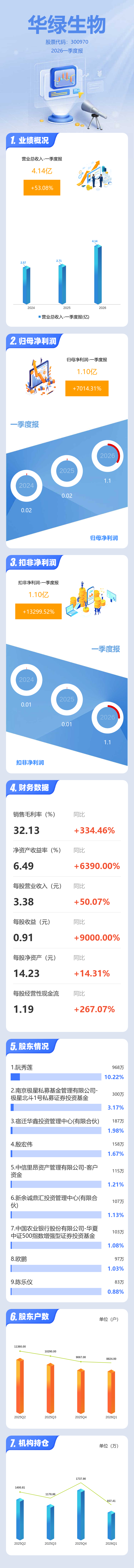 证券之星消息,华绿生物2026年一季报显示,一季度公司主营收入4.14亿元,同比上升53.09%;归母净利润1.1亿元,同比上升7014.32%;扣非净利润1.1亿元,同比上升13299.52%;负债率29.72%,财务费用-394.03万元,毛利率32.13%。