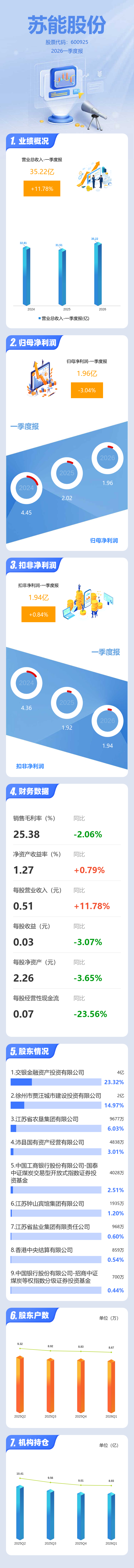 证券之星消息,苏能股份2026年一季报显示,一季度公司主营收入35.22亿元,同比上升11.78%;归母净利润1.96亿元,同比下降3.04%;扣非净利润1.94亿元,同比上升0.85%;负债率56.53%,投资收益-750.0万元,财务费用7191.55万元,毛利率25.38%。