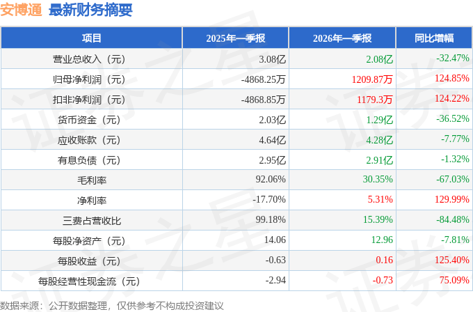 据证券之星公开数据整理,近期安博通(688168)发布2026年一季报。截至本报告期末,公司营业总收入2.08亿元,同比下降32.47%,归母净利润1209.87万元,同比上升124.85%。按单季度数据看,第一季度营业总收入2.08亿元,同比下降32.47%,第一季度归母净利润1209.87万元,同比上升124.85%。本报告期安博通公司应收账款体量较大,当期应收账款占最新年报营业总收入比达77.04%。