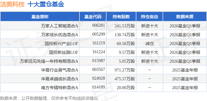 持有洁美科技最多的基金为万家人工智能混合A,目前规模为8.45亿元,最新净值3.7037(4月21日),较上一交易日下跌0.37%,近一年上涨75.76%。该基金现任基金经理为耿嘉洲。