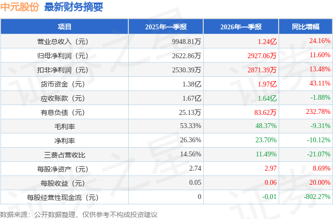 据证券之星公开数据整理,近期中元股份(300018)发布2026年一季报。截至本报告期末,公司营业总收入1.24亿元,同比上升24.16%,归母净利润2927.06万元,同比上升11.6%。按单季度数据看,第一季度营业总收入1.24亿元,同比上升24.16%,第一季度归母净利润2927.06万元,同比上升11.6%。本报告期中元股份公司应收账款体量较大,当期应收账款占最新年报归母净利润比达117.97%。
