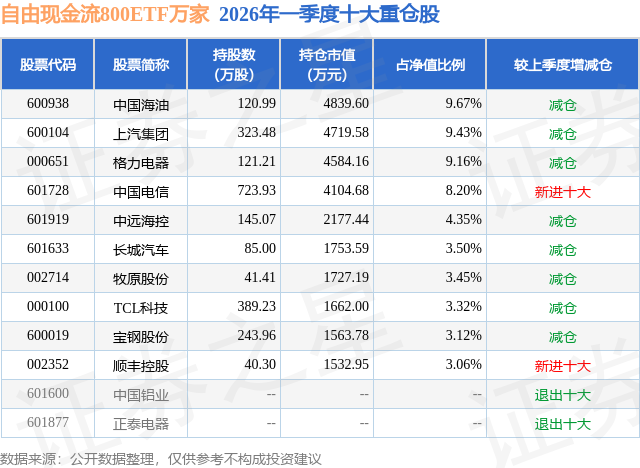 自由现金流800ETF万家基金成立于2025年7月16日,基金经理为贺方舟,基金跟踪标的为中证800自由现金流指数,成立以来超额回报为-1.91%,近一个月超额回报为0.15%。最新披露的基金持仓数据显示,截止2026年3月31日,该基金第一大重仓股为中国海油(600938),持股占比为9.67%。